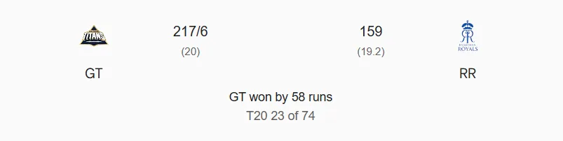 Chasing a daunting target of 218, RR’s innings faltered early with the loss of key wickets. Despite a resilient 52 off 32 balls from Shimron Hetmyer and a spirited 41 from captain Sanju Samson, RR struggled to build momentum. The disciplined bowling attack of GT, led by Prasidh Krishna with figures of 3/24, and supported by R Sai Kishore and Rashid Khan, who took 2 wickets each, restricted RR to 159 all out in 19.2 overs.