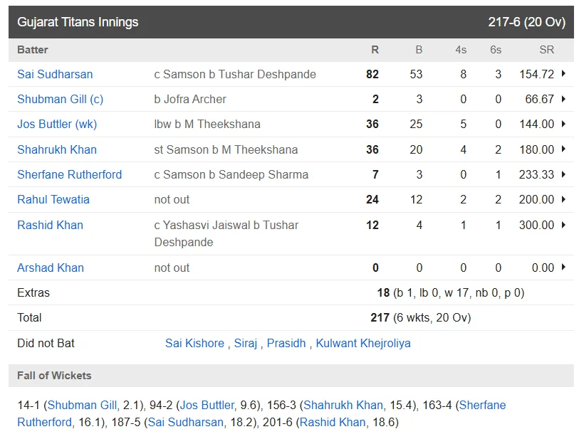 After being put into bat by RR, GT’s innings was anchored by a stellar performance from Sai Sudharsan, who scored a fluent 82 off 53 balls, marking his third half-century of the season. He was well-supported by contributions from Jos Buttler and Shahrukh Khan, each adding 36 runs. Their collective efforts propelled GT to a formidable total of 217/6.