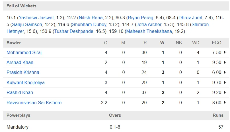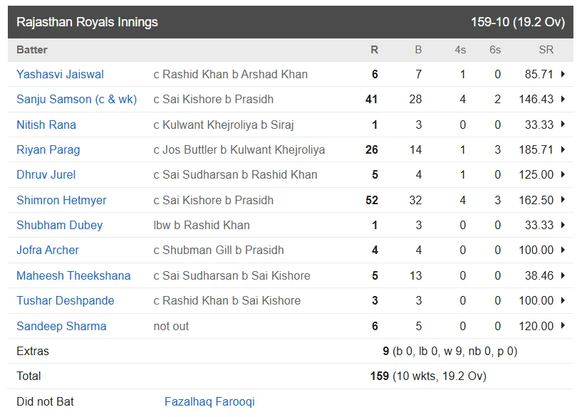 - Early Breakthroughs by GT Bowlers: Quick dismissals in the powerplay put RR on the back foot early in their chase.
